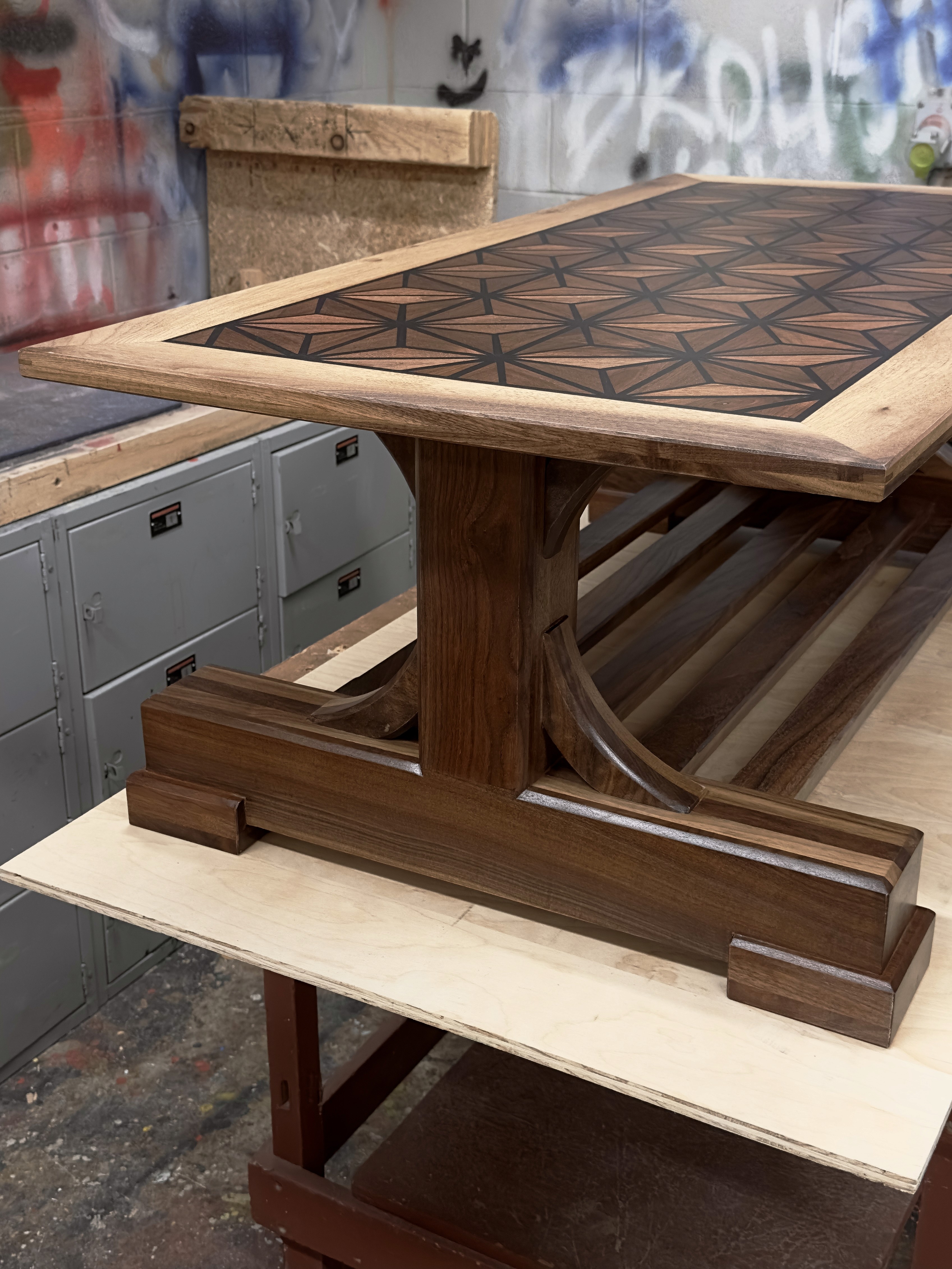 Made from solid walnut with a Kumiko-inspired geometric inlay of hand-cut triangles filled with black epoxy.